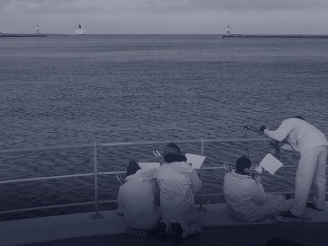 When it arrives in the sea, the river has reached both its maximum size and final stage. To mark the occasion, a brass band plays a piece, written especially for the river, at its mouth, paying it a special tribute. The musical aesthetic qualities of flowing waters feed into the composition, and the sound is led directly into the water. The piece does not portray the river, nor is it a simple homage; but rather, the work is translated back into the language of the river.